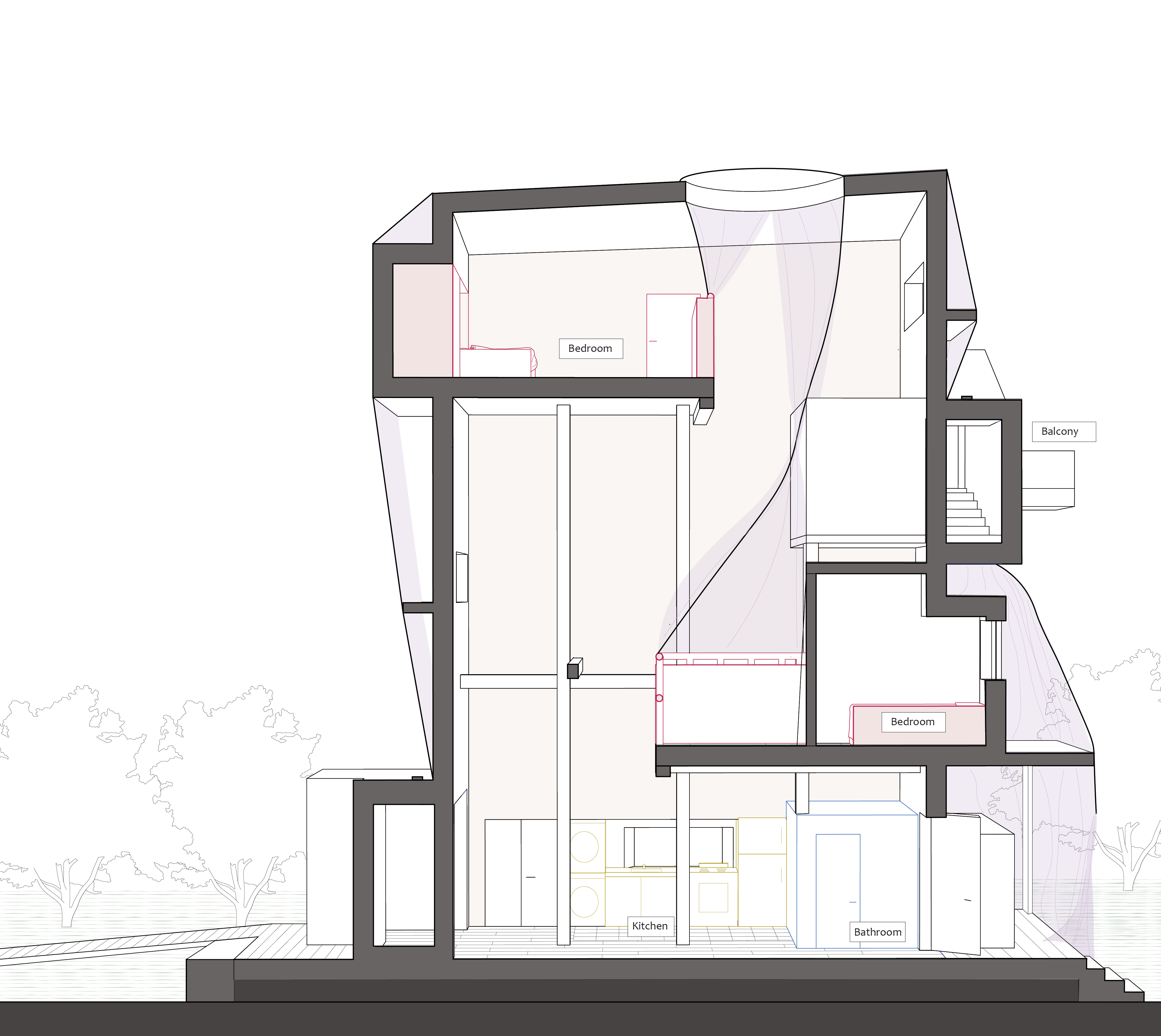 While most of the structure for the building is located in the prefab walls, five columns exist within the living space. These columns serve two functions. The first is to provide additional support for the bedroom floors. The other is to provide places of connection for the ground floor “moveable walls”. The moveable walls are another instalment of the use of fabric within the home (whatever the family would like; they get to choose their wallpaper). The fabric spans from individual columns to create dividers in the open plan ground floor. This lets the ground floor become adaptable and can be used as an entirely wheelchair accessible apartment.
