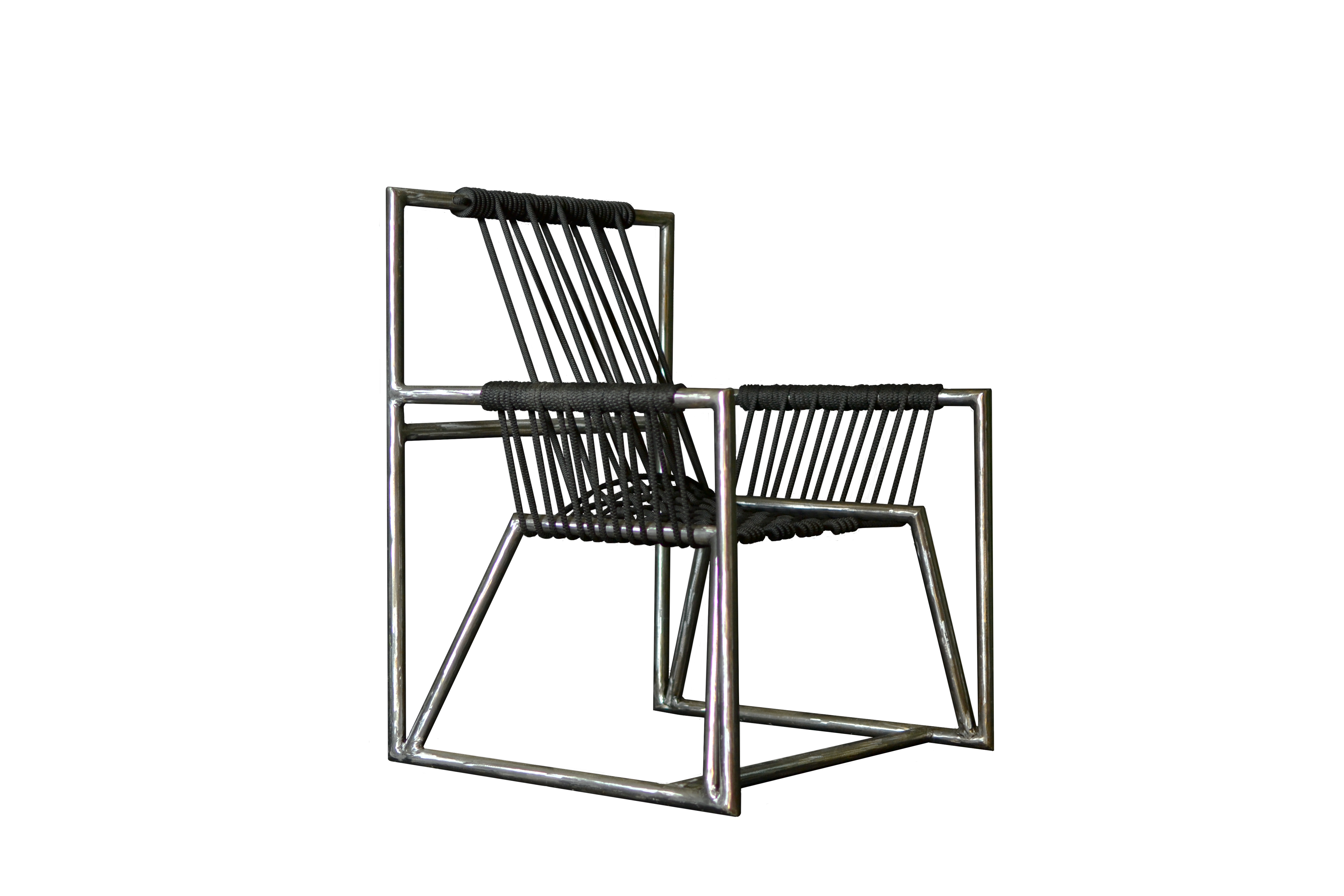 The Bungee Chair bounces. While the steel frame keeps the chair physically and visually grounded, the woven bungee chords bounce freely. The bungee chords pave the way to rethink how a body can be situated and move within rigid space. While most chairs depend on comfort based on height and body proportions, the Bungee Chair also considers weight. The more weight in the chair starts to increase comfort and provides a hug. Different sections of the chair support the body in various manners, depending on the weave and tension of the specific area.