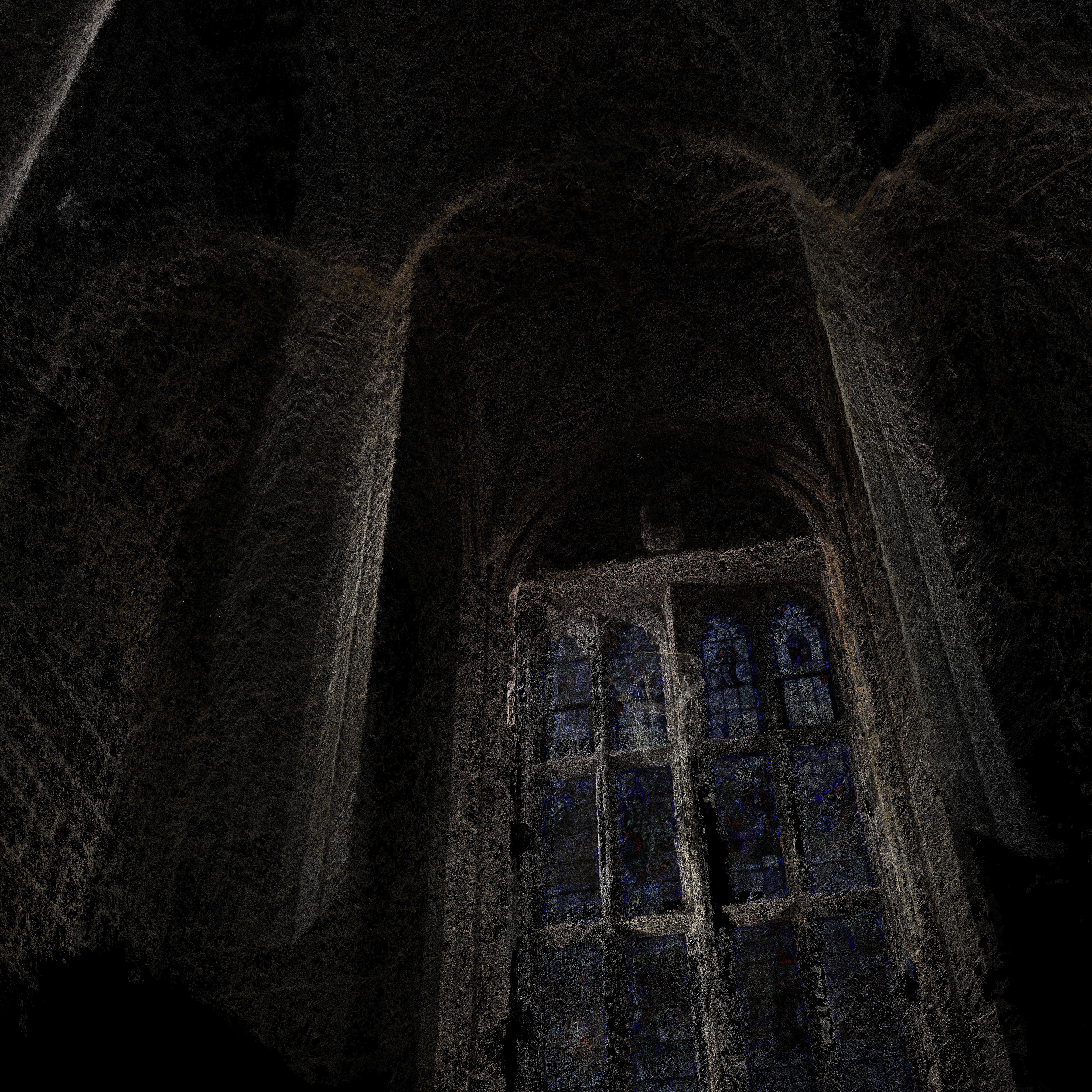 Controlling the density of the point cloud changed how I perceived the space depending on the amount of information shown. Depth of space and the visual language of diagramming these spaces can have different impacts depending on the background colour. Throughout this exploration, one thing became apparent. The undertone of the material gave a more impactful visual effect than the “actual” colour. The undertone mixed with different degrees of density changed how I perceived texture and solid void mass. For example, the stained glass windows became flattened with the colour of the sky outside. They turned this ornamental, decorative, and translucent material into something with the same importance as the stone from which the Bapst Library was built.